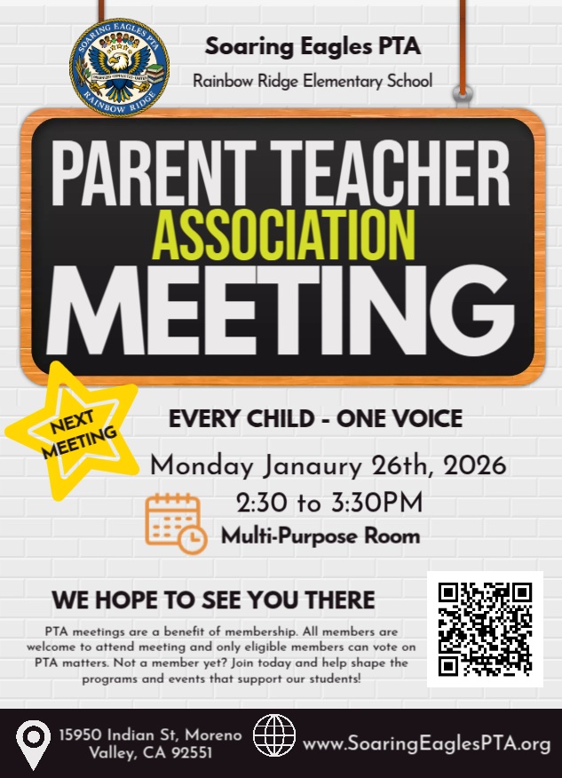 Join us for our next PTA meeting—your voice and ideas make a difference! 2:30pm at Rainbow Ridge MPR